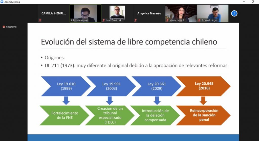 El pasado 8 de octubre, el profesor John Henríquez expuso en el seminario “Compromisos de Cese, Indemnizaciones y Criminalización en el Derecho de la Competencia”, organizado por el semillero de competencia económica del capítulo de América Latina de la Academic Society for Competition Law (ASCOLA). En el referido seminario, Henríquez presentó su artículo “Proyecto de ley anti colusión: oportunidades y riesgos en su tramitación”, publicado previamente por la Revista Actualidad Jurídica de la Universidad del Desarrollo.