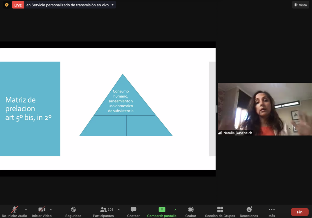 La sesión se dividió en tres temas: «Nueva configuración de los derechos de aprovechamiento», expuesto por la profesora Boettiger, «Priorización del consumo humano», de Dasencich, e «Inscripción y regularización de derechos», de Crocco.