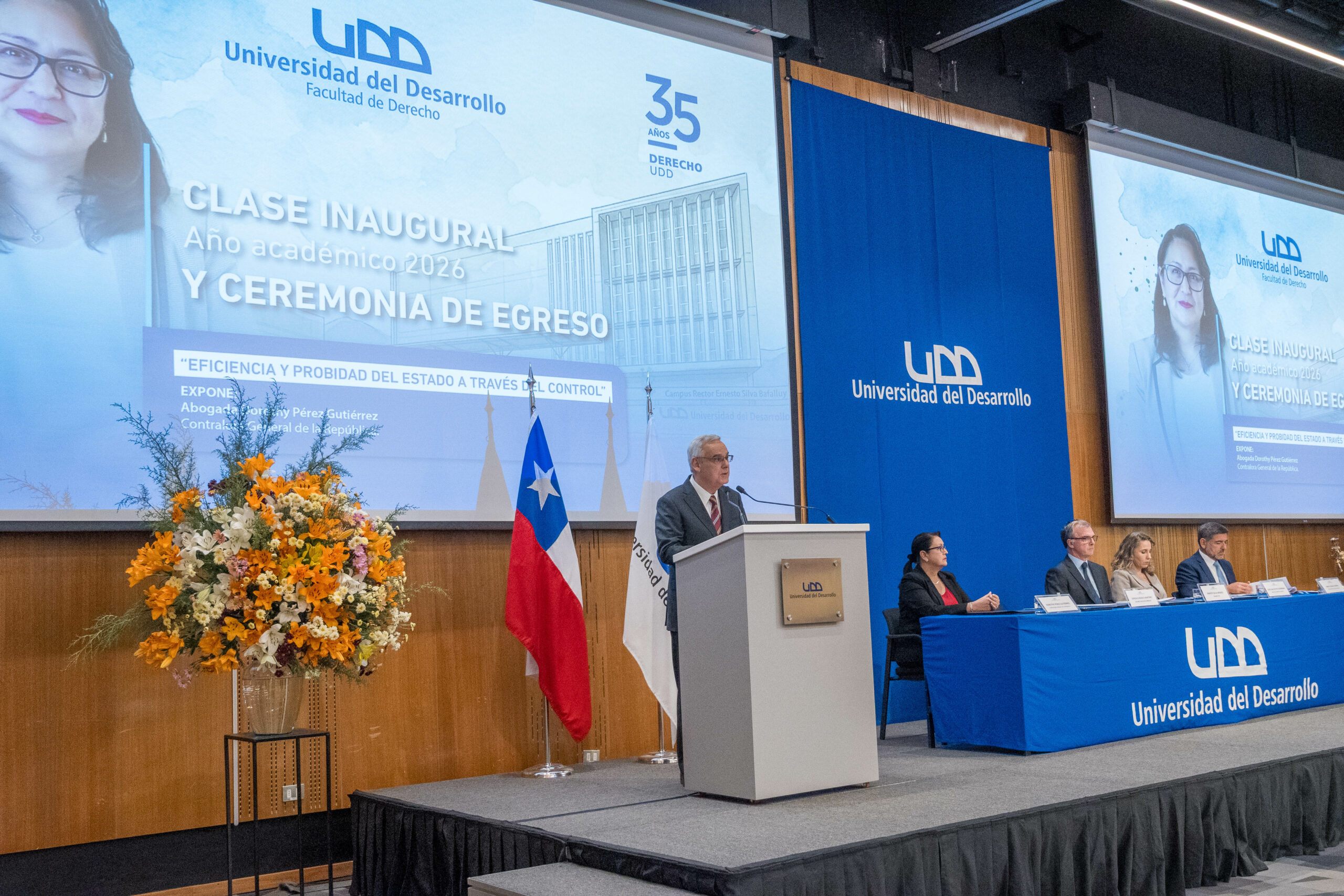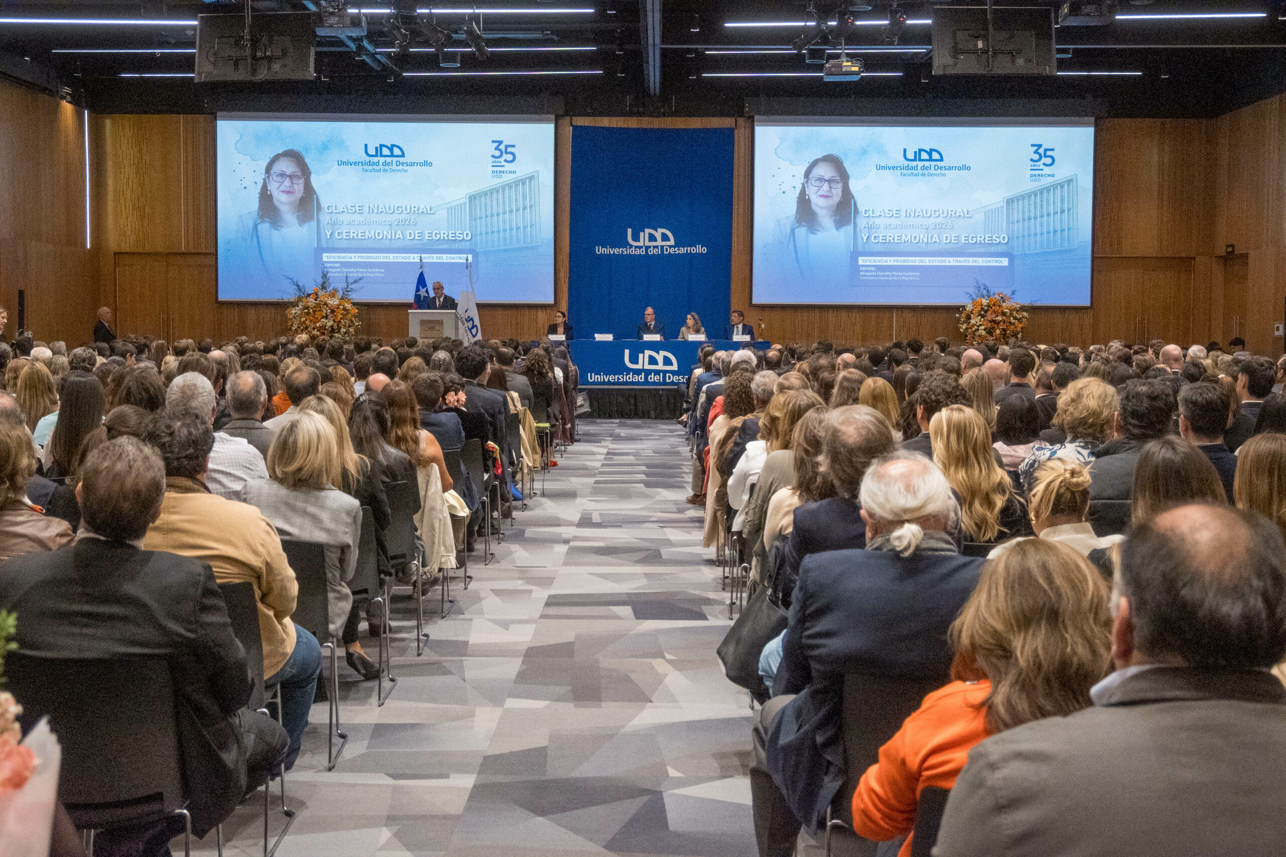 En el marco de la inauguración del año académico 2026, la Facultad de Derecho de la Universidad del Desarrollo, sede Santiago, realizó su tradicional clase inaugural, la que este año estuvo a cargo de la Contralora General de la República, Dorothy Pérez.