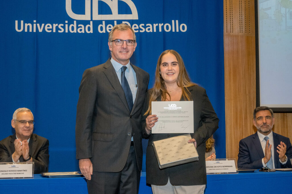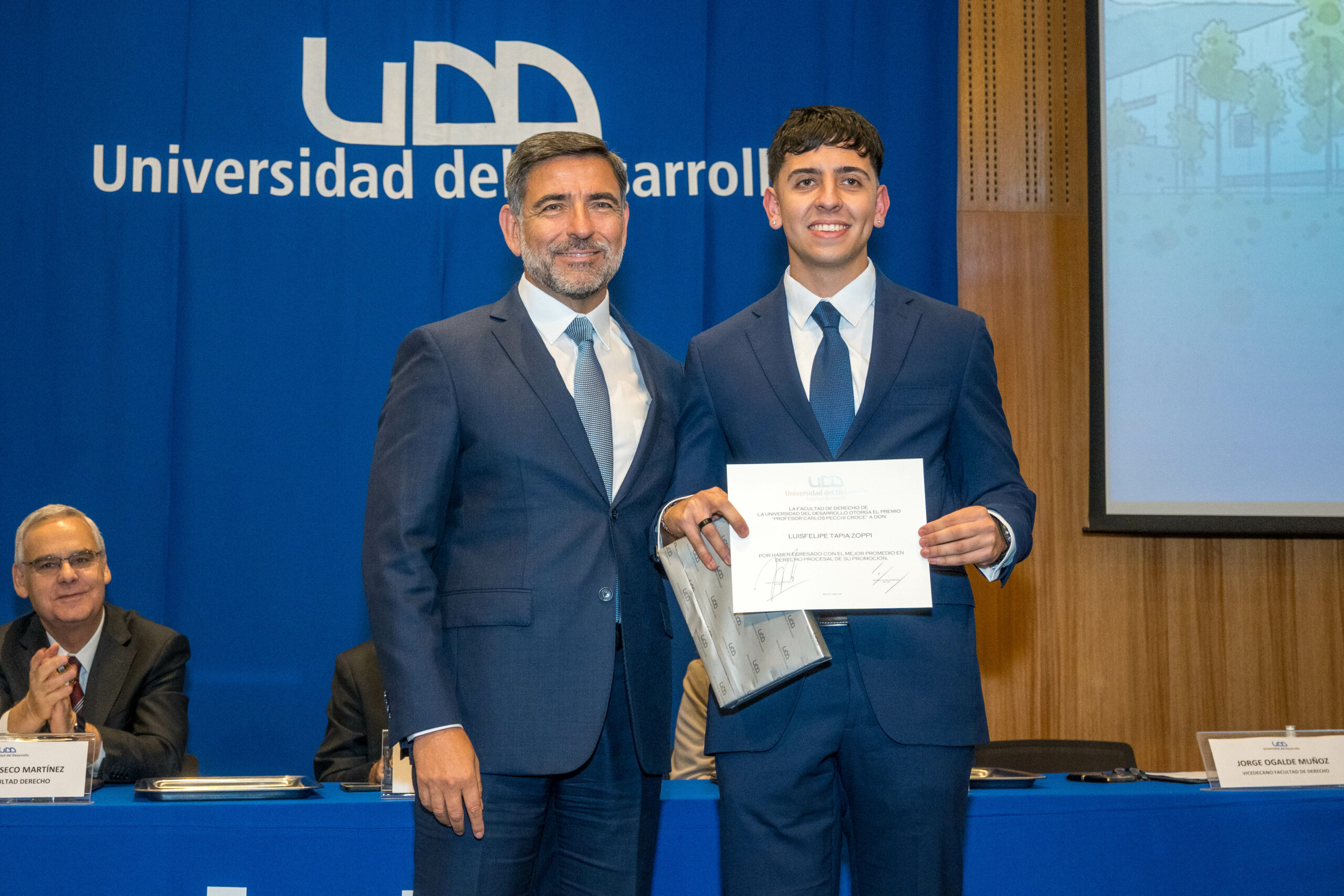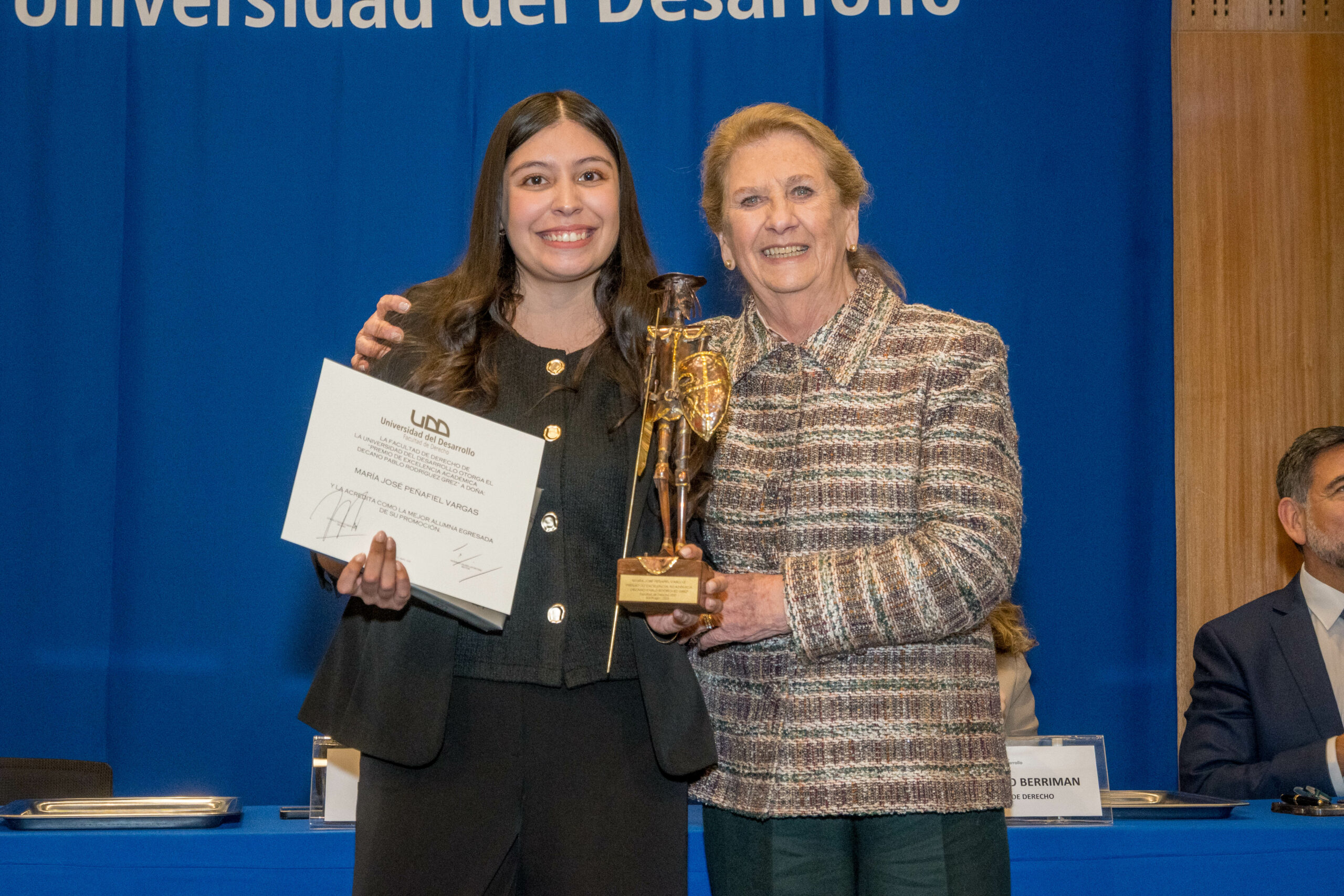 Como es tradición, durante la ceremonia se reconoció a los estudiantes con los más altos méritos académicos de la generación 2026. El premio a la mejor alumna de la generación, “Decano Pablo Rodríguez Grez”, fue otorgado a María José Peñafiel Vargas. Asimismo, se distinguió a Luis Felipe Tapia Zoppi con el premio al mejor promedio en Derecho Procesal, y a Maite Alejandra Correa Astaburuaga con el premio al mejor promedio en Derecho Civil.